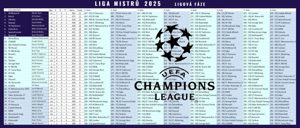 - CHAMPIONS LEAGUE se účastnilo 36 týmů, které byly umístěné v podzimní žebříčku LB od 1. do 35. místa + loňský vítěz Válec Bohemka 27 (za názvem týmu a jménem kouče je v tabulce uvedena soutěž, které se tým aktuálně účastní). KONEČNÁ TABULKA Ligové fáze a rozlosování dalších zápasů play-off Champions League je níže.