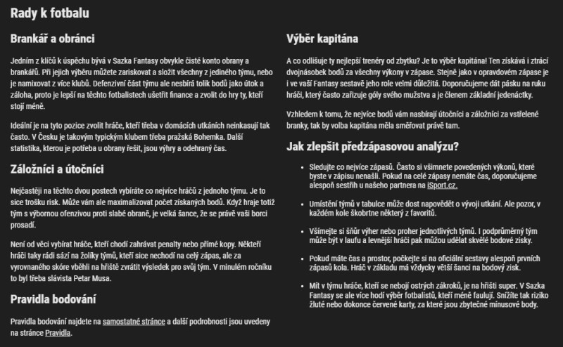 - Naštěstí i na portálu Sazka Fantasy zůstávají adrenalinové vzájemné duely týmů ve skupinách a tak boj o titul mistra zůstává na stejných principech, jako v loňské sezóně. Bohužel ostatní pravidla z Fan-ligy, včetně bodování hráčů, jsou jiná.