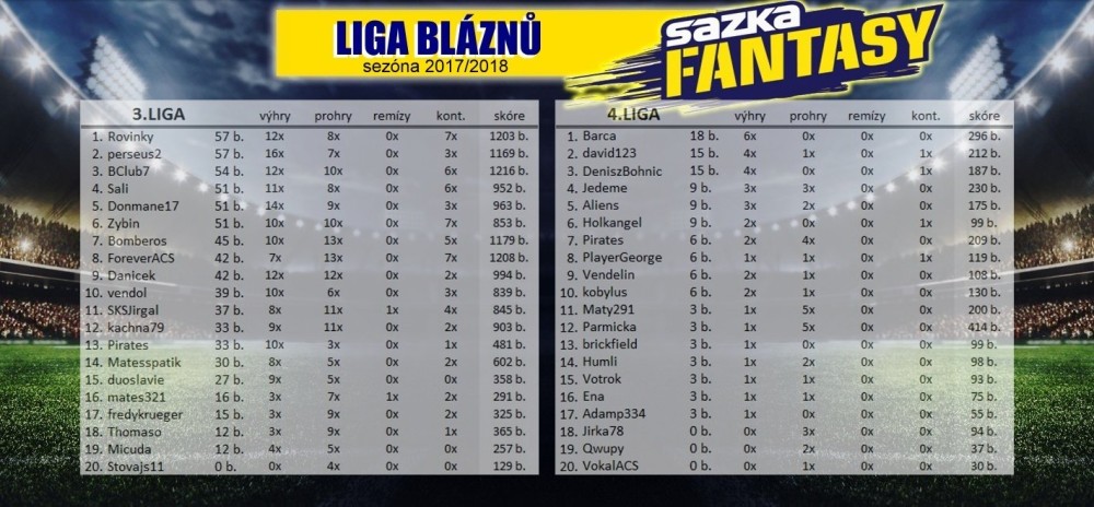 - V třiceti kolové sezóně v týmové soutěži na Sazka Fantasy vybojoval titul mistra Ligy bláznů s 64 body tým BOSSICEK, koučovaný Karlem Petráčkem. Týmy na druhém až pátém místě měli na svém kontě shodně 60 bodů, o pořadí tudíž rozhodovalo skóre. Druhý v tabulce se umístil tým EVALD, koučovaný Jirkou Malým. Třetí místo vybojoval tým ACS Huricanos kouče Miroslava Matouška.